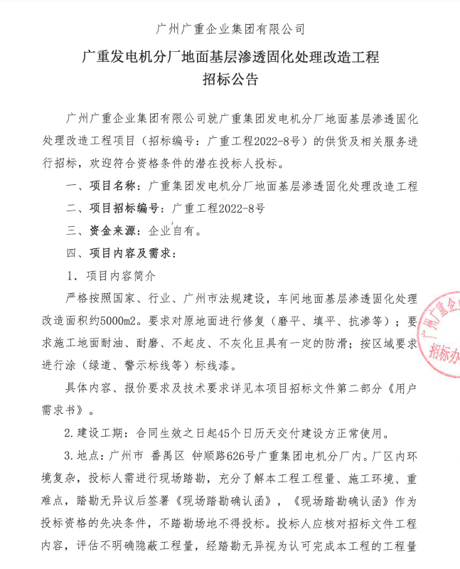 AK(中国)集团发电机分厂地面基层渗透固化处理改造工程招标公告